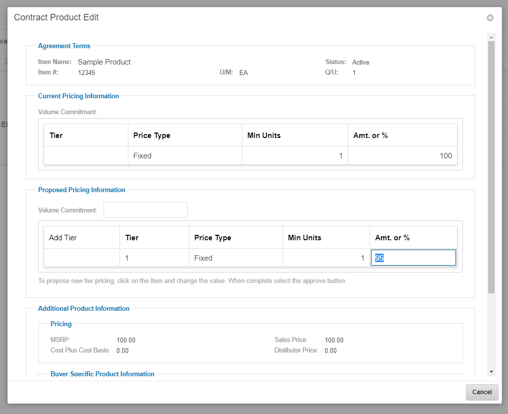 On the Contract Product Edit popup, double-click on the Amt. or % cell under the Proposed Pricing Information section and enter a new price.