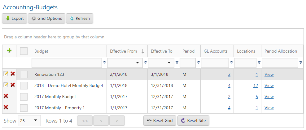 As you will see, making changes this way comes in the form of a grid with inline editing capabilities. Each row designates a GL Account and each column a Budget Period.