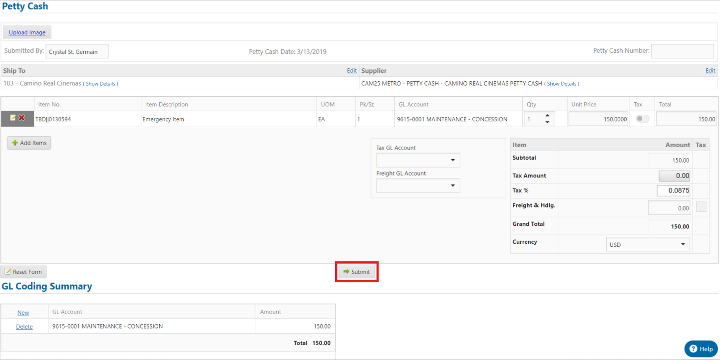 The Petty Cash Form is used to submit petty cash type transactions for reimbursement. This form is very similar to the Requisition Form with the primary differences being that only one supplier is available to select from when using this form and there is no order transmission associated with orders placed using this form.
