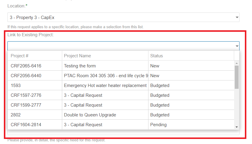 Select an existing project to link the Capital Request to, if applicable. This will attach all the information within the Capital Request to the existing project and a new project will not be created.
