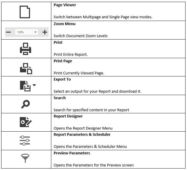 II - The Output Option Selects how the document will be ran. By selecting “Preview” you will be brought to a PDF friendly view of the report and its contents. From here you will have many more options.